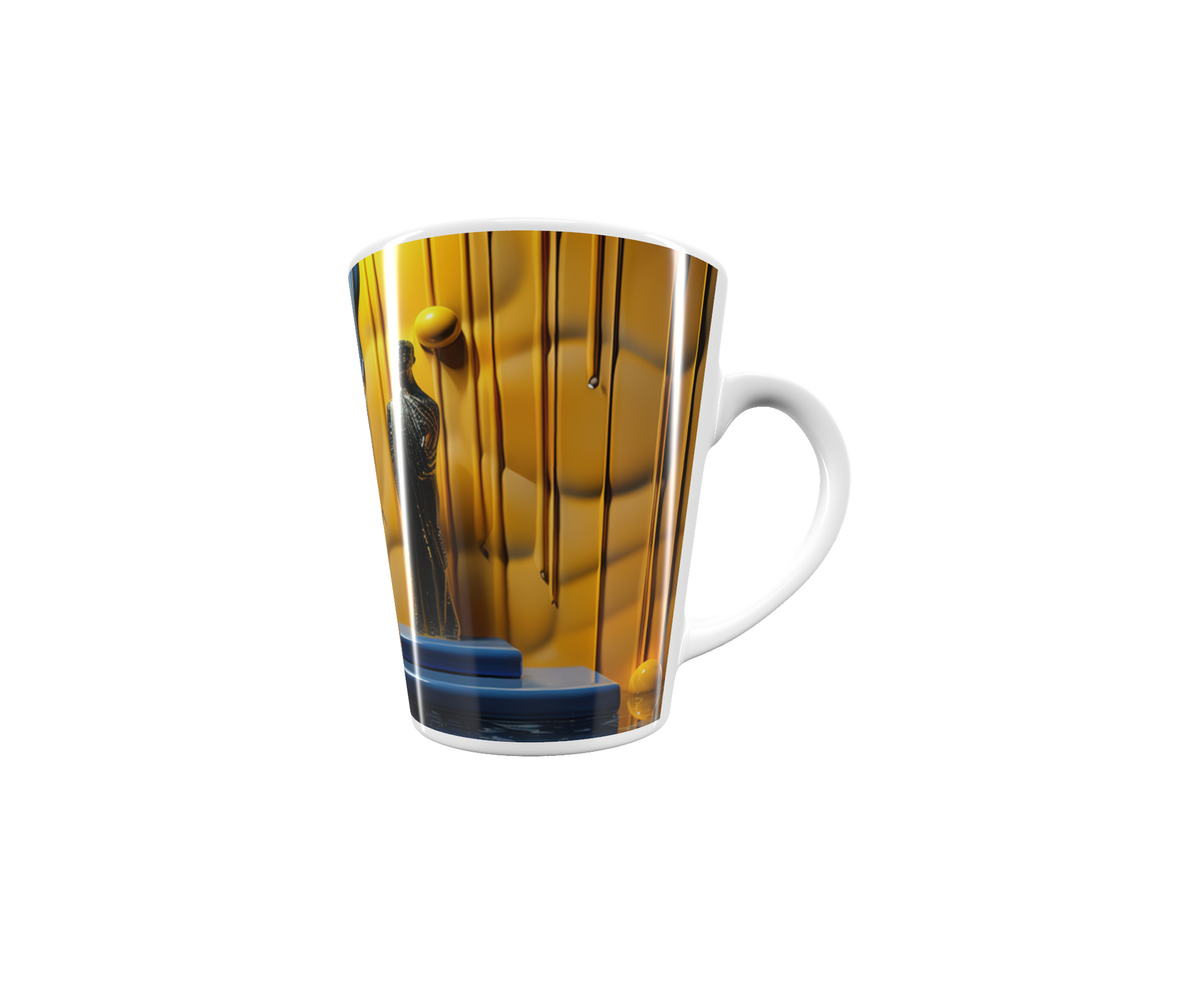 Die Latte-Tasse Goldene Stille verbindet klare Symbolkraft mit luxuriöser Farbgebung. Goldene Flächen fließen wie geschmolzenes Metall, kontrastiert von kühlem Blau, das Tiefe und Ruhe ausstrahlt. Eine schlanke Figur steht erhaben im Zentrum – geheimnisvoll, würdevoll und voller Bedeutung.