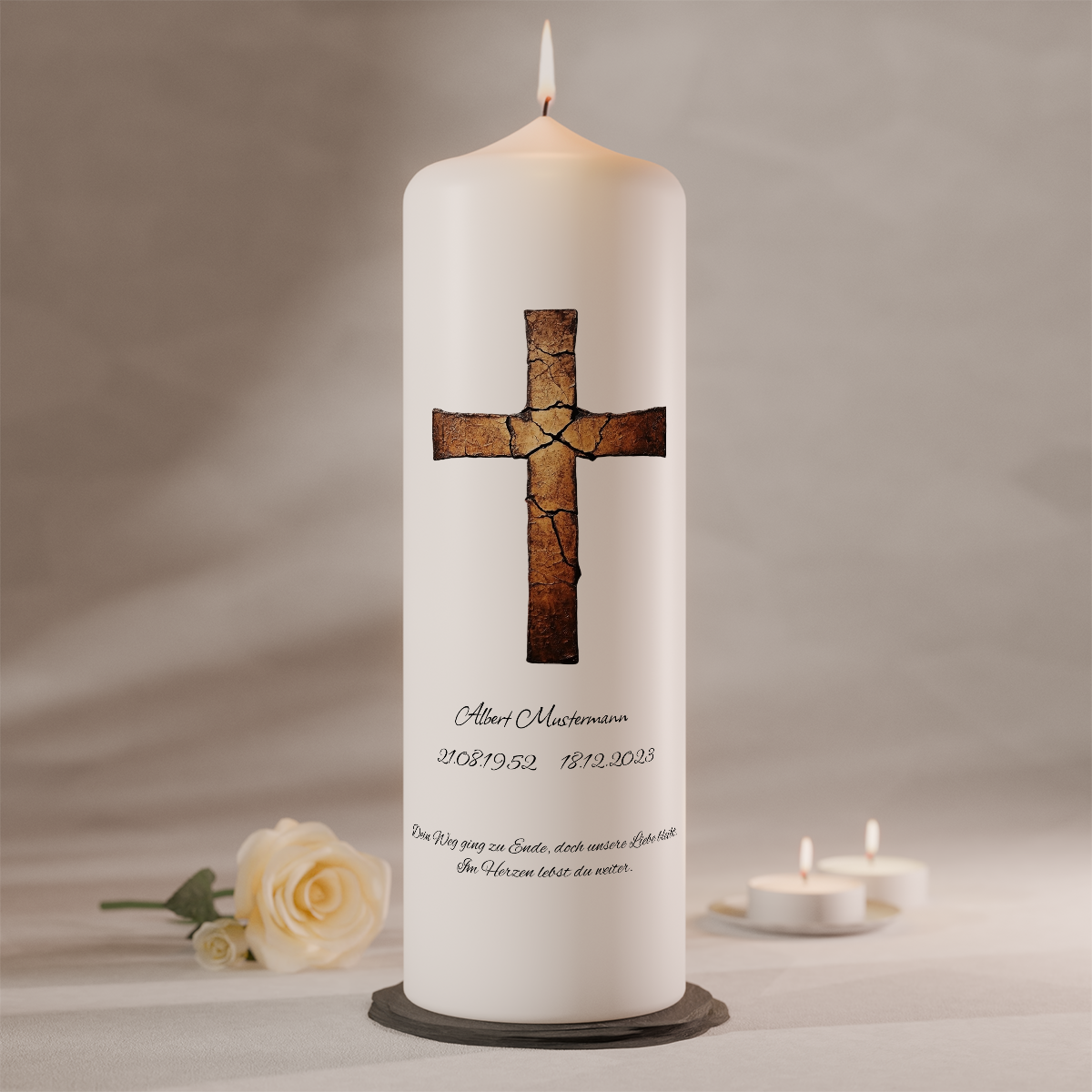 Die Trauerkerze „Gebrochenes Kreuz Kupfer“ vereint Symbolkraft und Würde.
