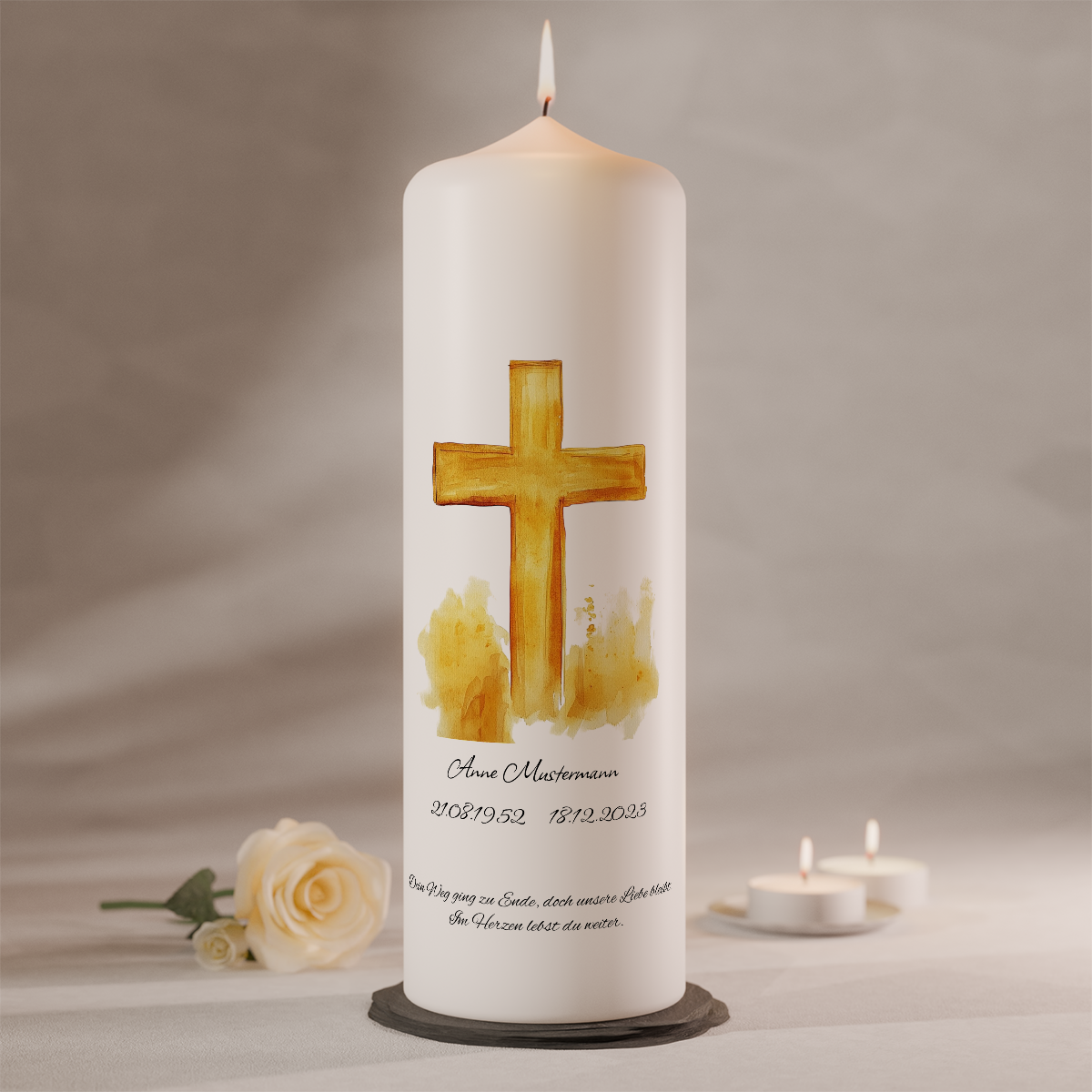 Die Trauerkerze „Kreuz in Gold-Aquarell“ strahlt Würde, Licht und Hoffnung aus.