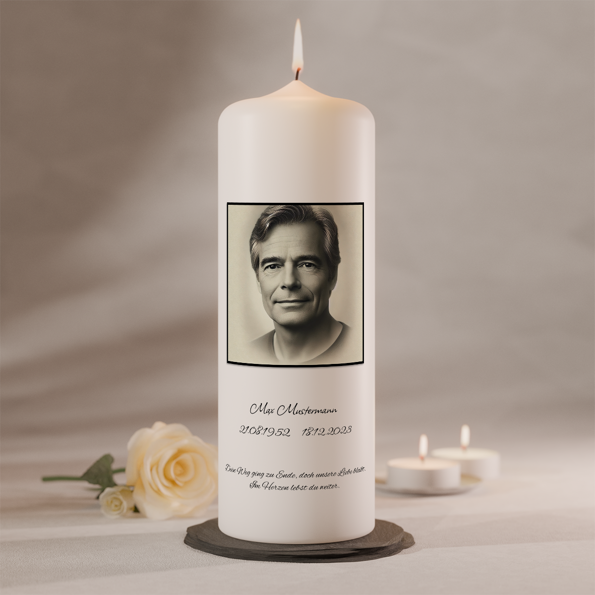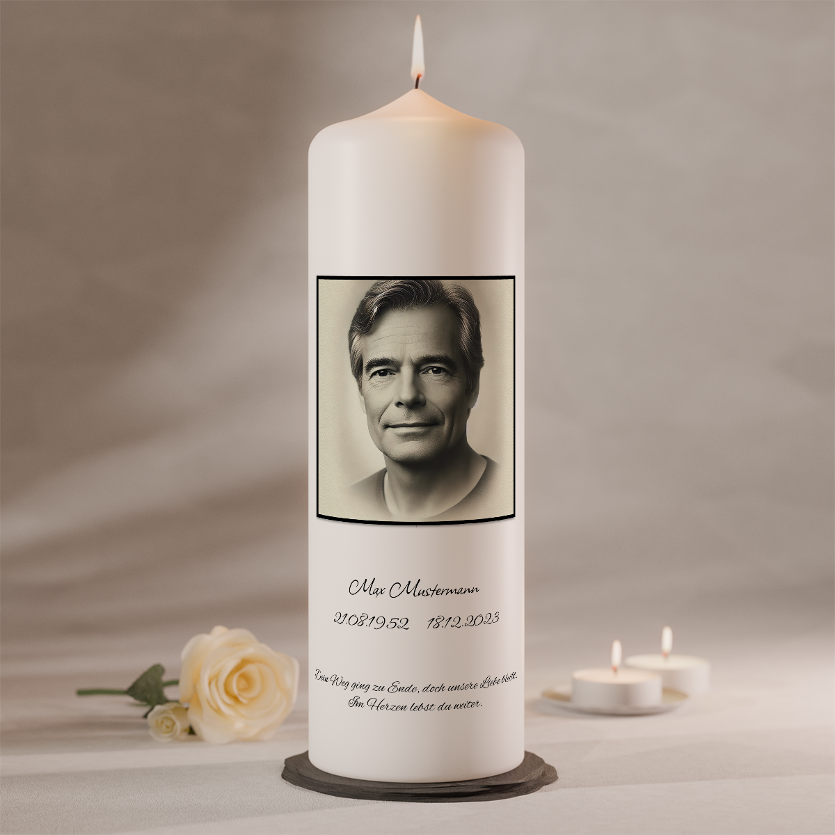 Diese Gedenkkerze mit Foto eignet sich ideal für Trauerfeiern, Gedenktage oder als bleibende Erinnerung zu Hause.