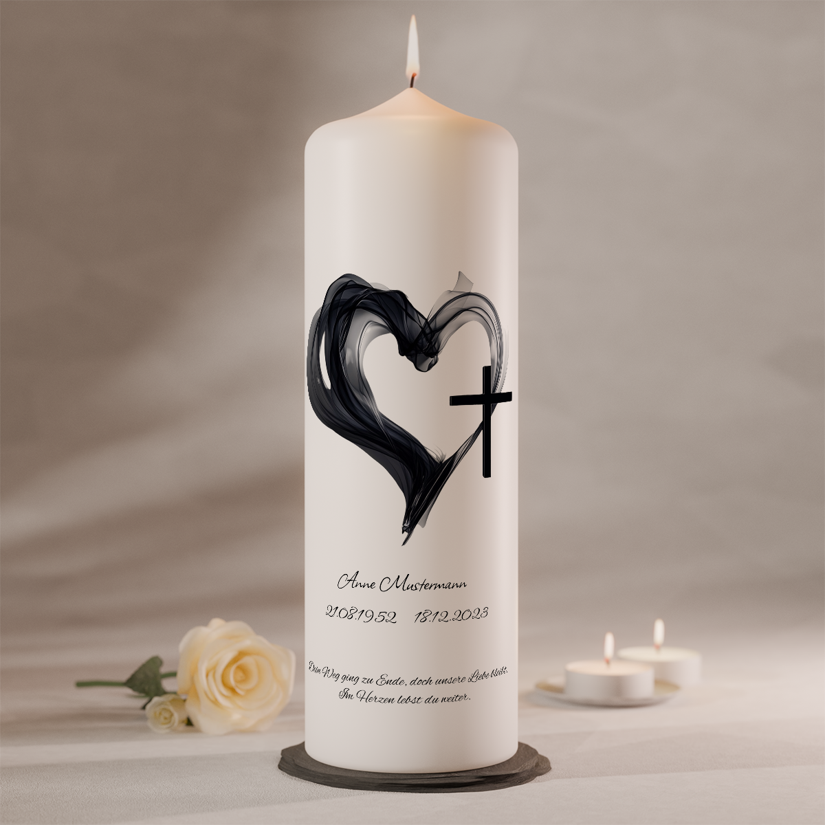 Personalisierbare Gedenkkerze mit Herzsymbol und Kreuz auf weißer Trauerkerze