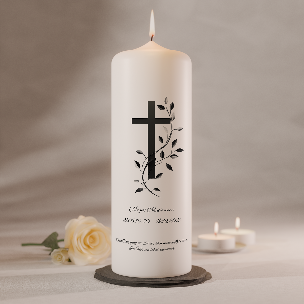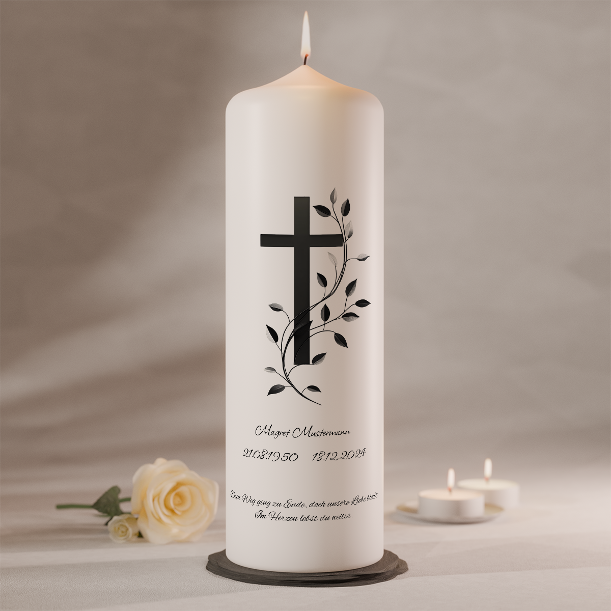 Die Trauerkerze „Kreuz & Blattranke“ vereint Glauben, Natur und Trost in einem stilvollen, ruhigen Design.
