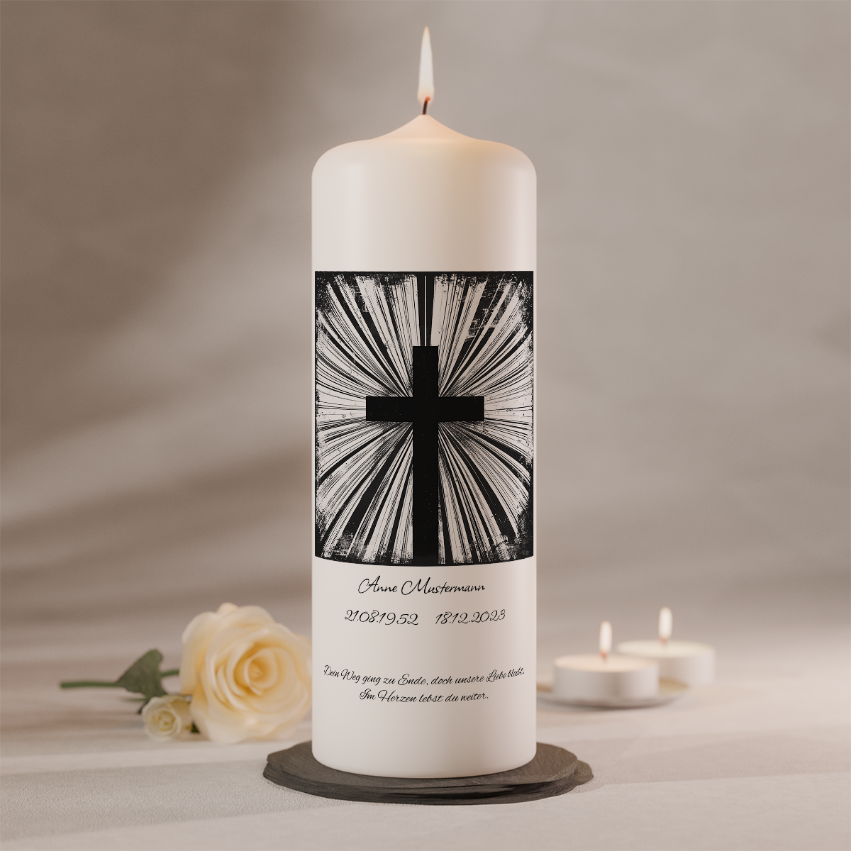 Individuell personalisierbar mit Name, Lebensdaten und Spruch wird diese Kerze zu einem besonderen Erinnerungslicht.