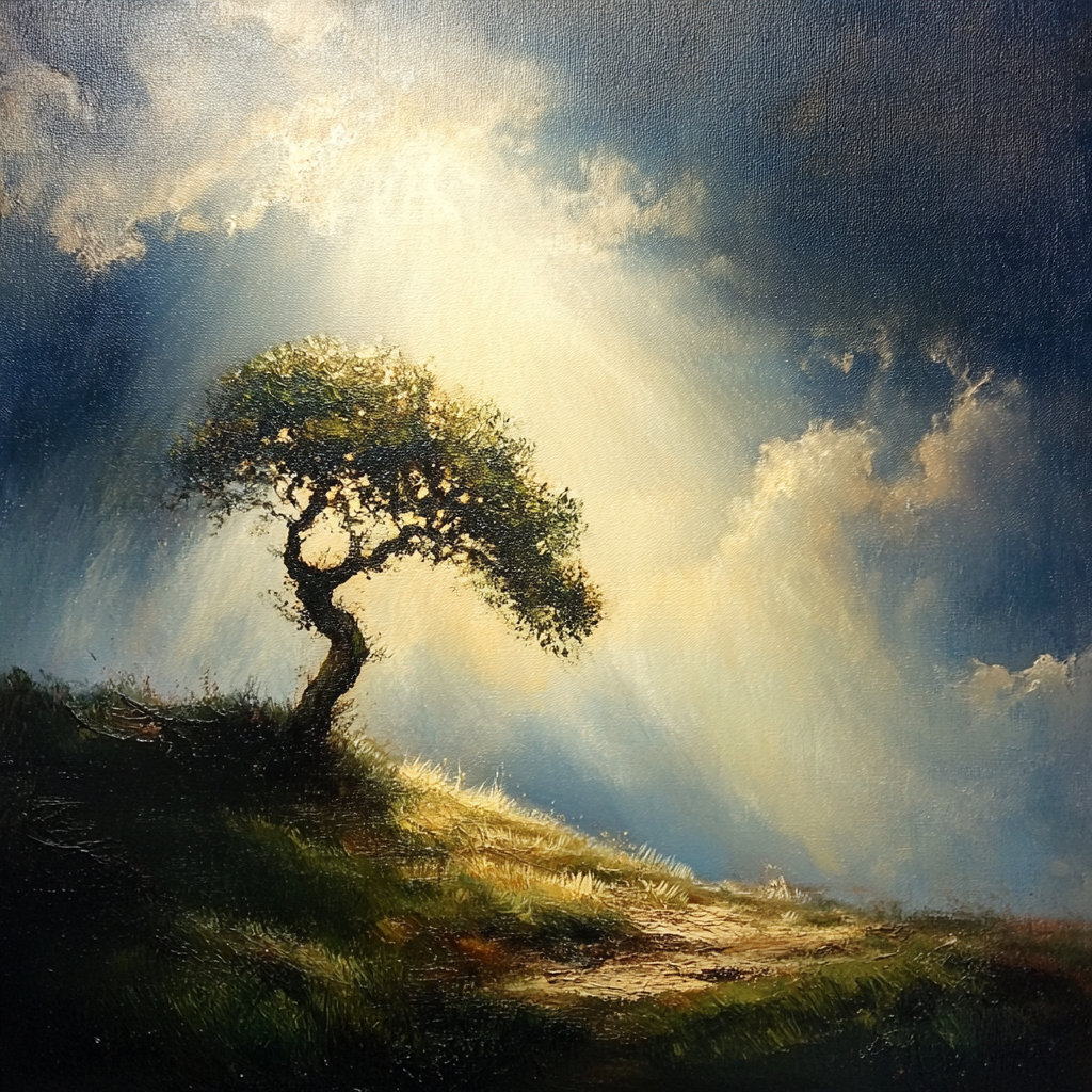 „Baum im Licht“ ist ein ergreifendes Gemälde über Hoffnung, Stärke und die stille Verbindung zwischen Erde und Himmel.