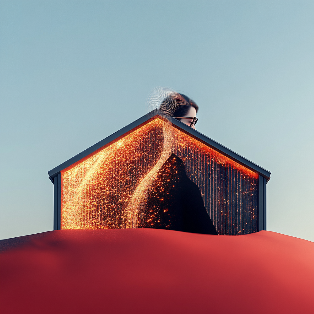 „Das leuchtende Ich“ erforscht das Zusammenspiel von Innerem und Äußerem – zwischen Mensch und Architektur, Licht und Materie. In einer klaren, fast futuristischen Komposition steht eine Figur innerhalb eines glühenden Rahmens, der wie ein Haus aus Energie wirkt. Der warme Strom aus Lichtpartikeln symbolisiert Bewusstsein, Wärme und Selbstwahrnehmung. Dieses Werk vereint minimalistische Klarheit mit emotionaler Tiefe – eine visuelle Meditation über Identität im digitalen Zeitalter.