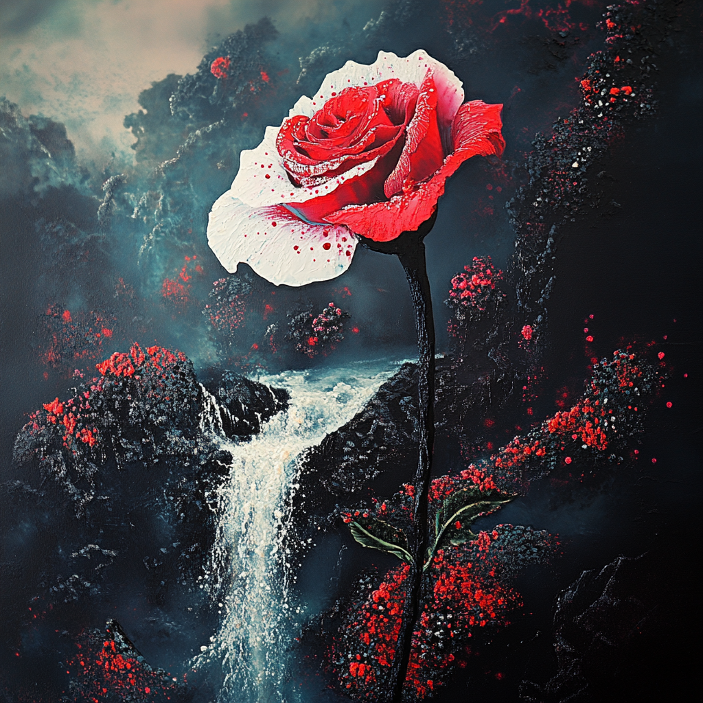 Im Hintergrund rauscht ein wilder Wasserfall über schroffe, dunkle Felsen – eine unaufhaltsame Kraft, die an die Zeit erinnert, die alles fortspült, und an die ständige Bewegung des Lebens. Die umliegende Landschaft, düster und voller zerklüfteter Felsen, ist mit kleinen roten Blüten übersät, die wie stille Zeugen des Überlebenskampfes der Hauptrose wirken.