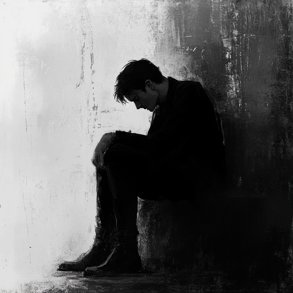 Ein Mann sitzt mit gesenktem Kopf, in sich zusammengesunken, an eine Wand gelehnt – gefangen zwischen Schwarz und Weiß, zwischen Licht und Leere.