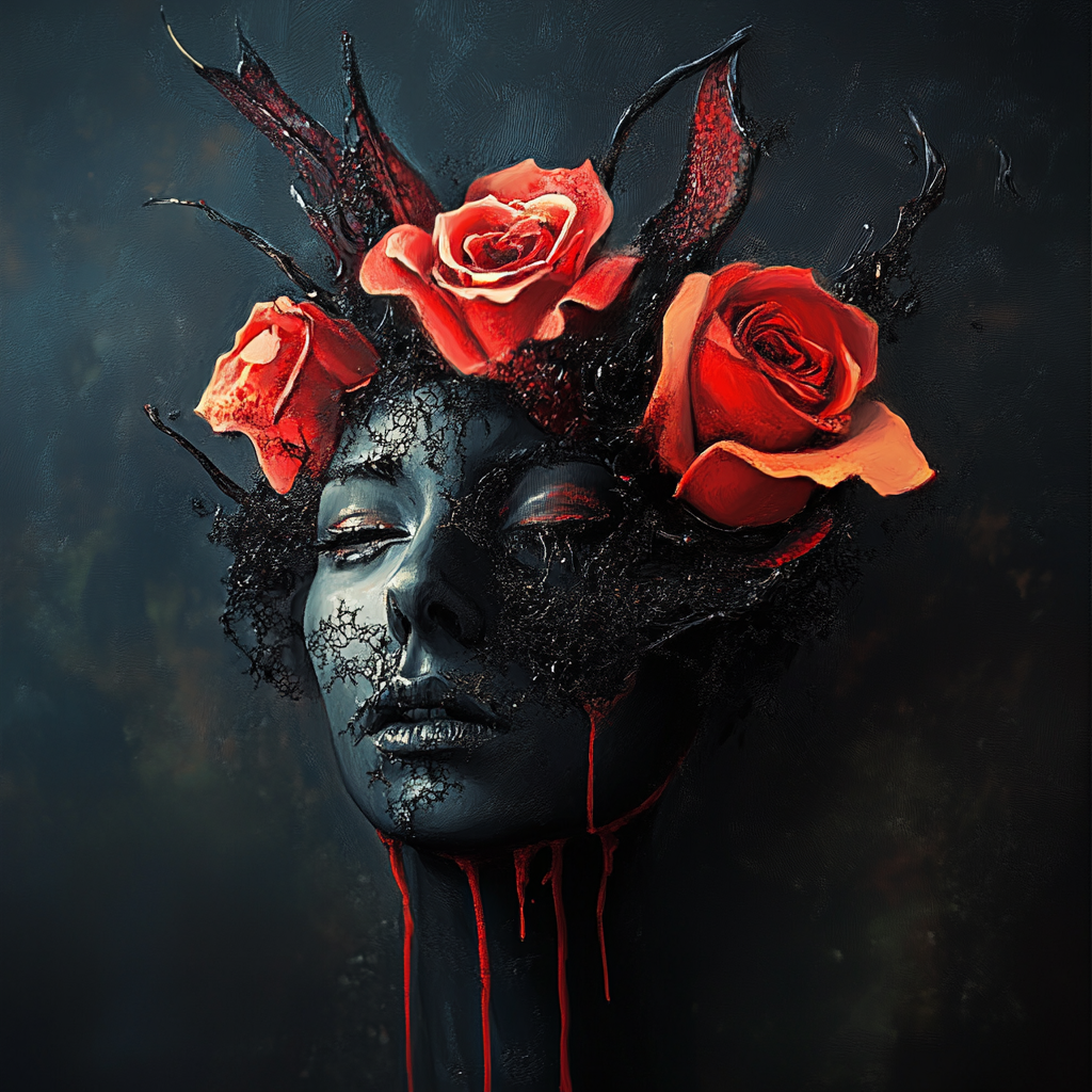 Aus dem Kopf der Figur sprießen blutrote Rosen, deren intensive Farbe in starkem Kontrast zum düsteren Teint steht. Diese Rosen – Symbole für Liebe, Leidenschaft und Schmerz – sind nicht nur schön, sondern auch bedrohlich, umgeben von dunklen, dornenartigen Ästen, die sich wie ein verzweigtes Netz über das Gesicht legen. Die schwarzen Spitzen, die fast an Krallen erinnern, wirken wie Gefängnisgitter, die das fragile Innere umschließen und gleichzeitig durchbohren.