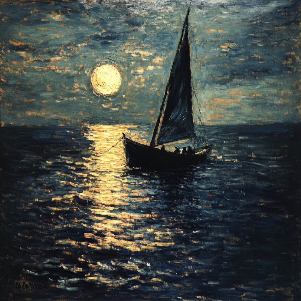 Ölgemälde eines Segelboots, das im goldenen Licht des Mondes über das dunkle Meer gleitet – poetische Szene voller Stille und Tiefe.