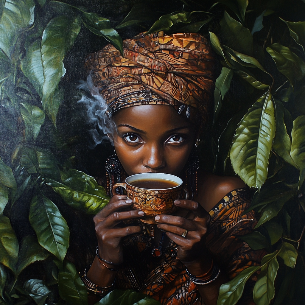 Die Frau im Zentrum des Werkes – in ein kunstvoll gemustertes Tuch gehüllt – hält eine Tasse dampfenden Tees, deren Aroma sich mit dem feuchten Grün der Pflanzen vereint.