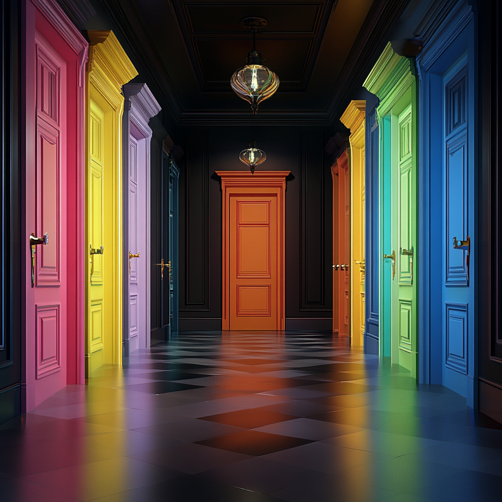 Korridor mit bunten Türen in allen Farben des Spektrums, symbolisch für Entscheidungen.