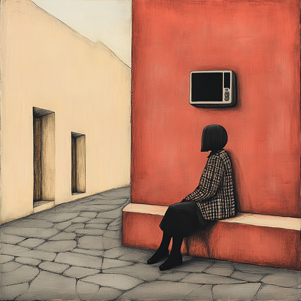 Die Figur ist vollständig in Schwarz gekleidet, mit einem gemusterten Mantel, der dem Bild einen Hauch von Individualität gibt. Der fehlende Gesichtsausdruck lässt Raum für Interpretationen und symbolisiert möglicherweise Anonymität, Isolation oder Reflexion. Die starren architektonischen Linien und der leere Fernseher verstärken die Atmosphäre der Stille und Abgeschlossenheit.