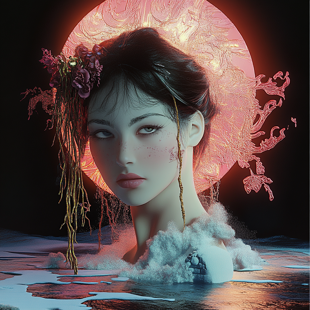 Die feinen Blüten und goldenen Linien im Haar verbinden Natur und Göttlichkeit, während Wasser und Licht die Grenzen zwischen Mensch und Universum auflösen.