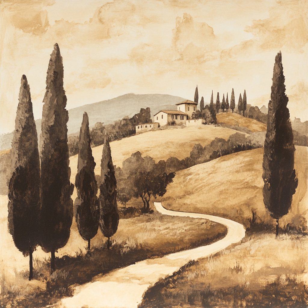 Sepiafarbenes Landschaftsgemälde mit Zypressen, sanften Hügeln und einem toskanischen Landhaus unter weichem Himmel.