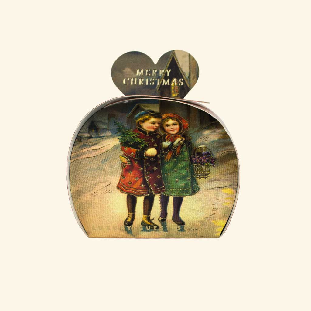 Die Seife steckt in einer herzförmigen Geschenkverpackung mit nostalgischem Wintermotiv: zwei Kinder in festlicher Kleidung tragen einen kleinen Weihnachtsbaum durch die verschneite Straße – eine Hommage an klassische Weihnachtskarten.