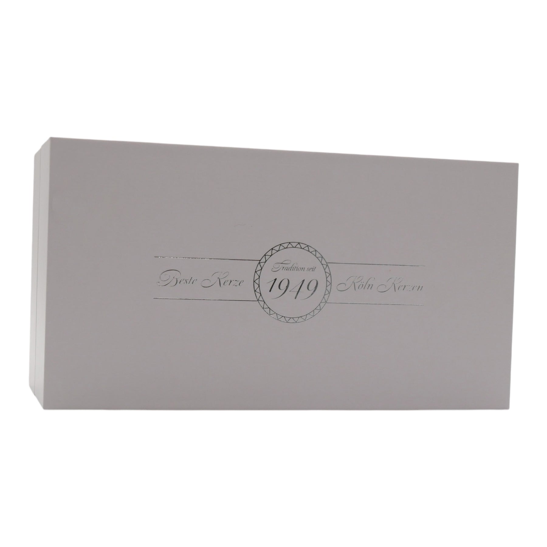 Geschlossene Aufbewahrungsbox mit silbernem Logo „Beste Kerze – Tradition seit 1949 – Köln Kerzen“ – edle Verpackung für Taufkerzen und Geschenkkerzen