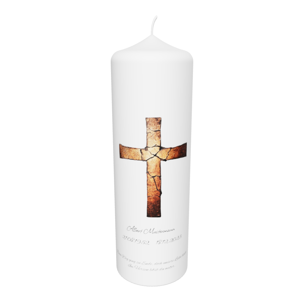 Die Trauerkerze „Gebrochenes Kreuz Kupfer“ vereint Symbolkraft und Würde.