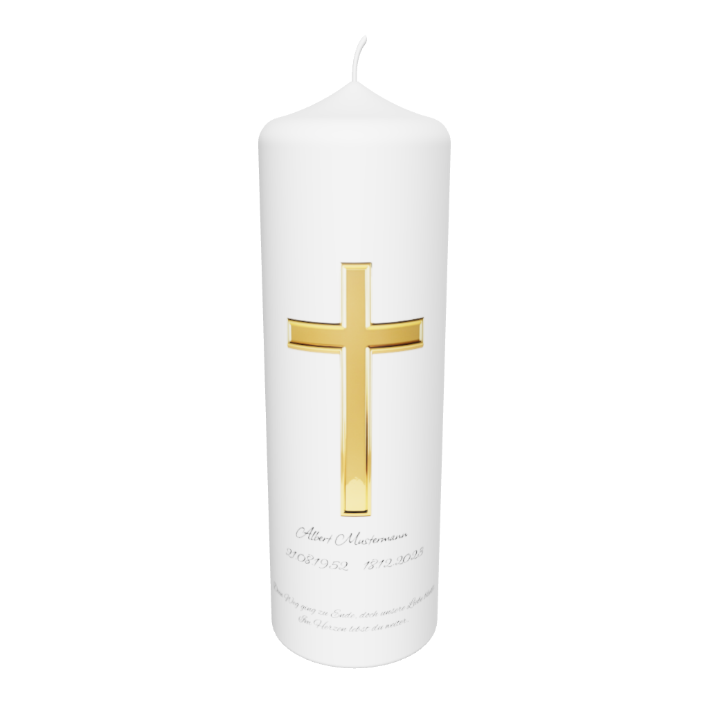 Die Trauerkerze „Goldenes Kreuz“ steht für Licht, Glaube und die Hoffnung auf ein Wiedersehen.