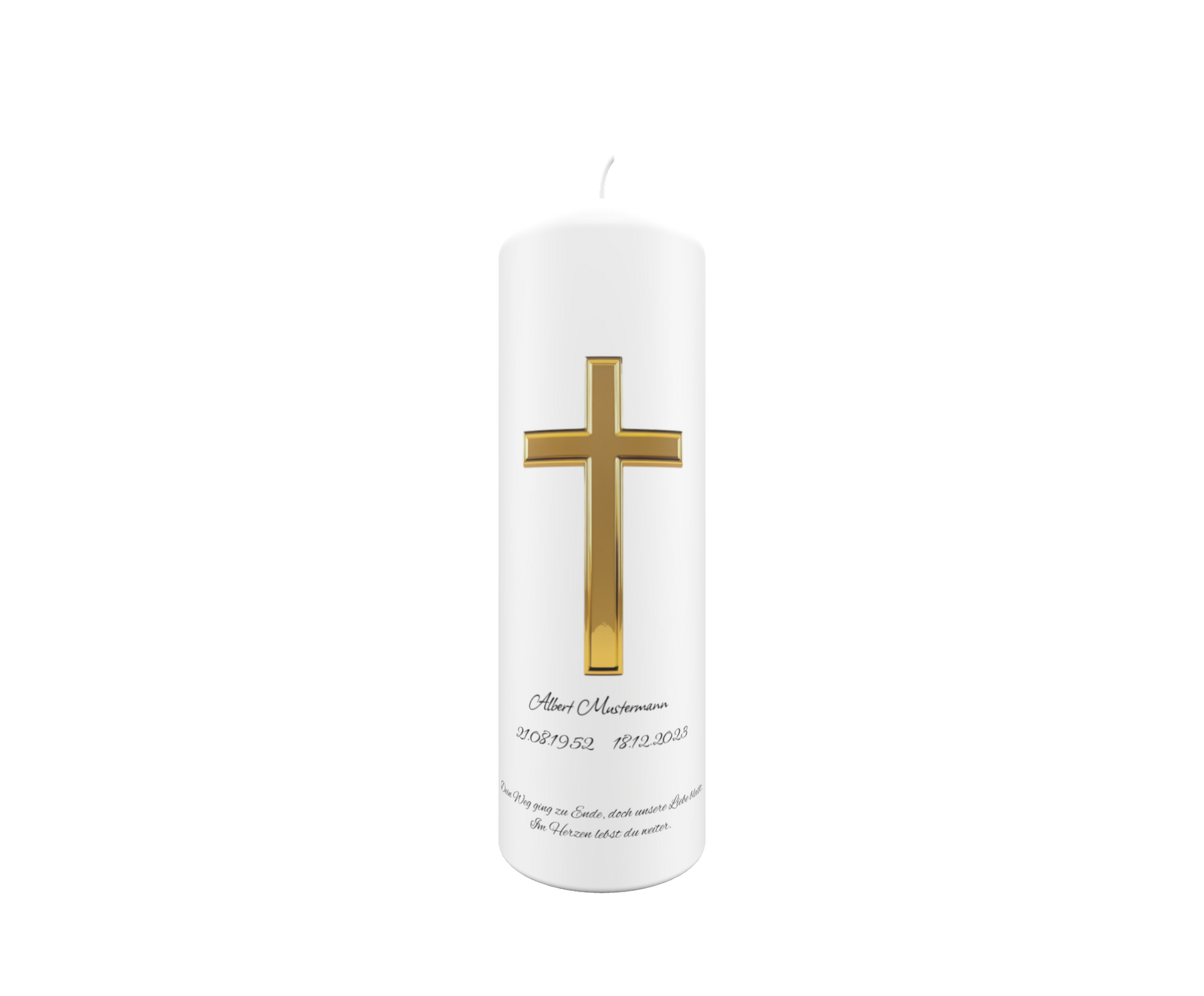 Individuell personalisierbar mit Name, Geburts- und Sterbedatum sowie einem persönlichen Spruch wird diese Kerze zu einem einzigartigen Gedenkstück.