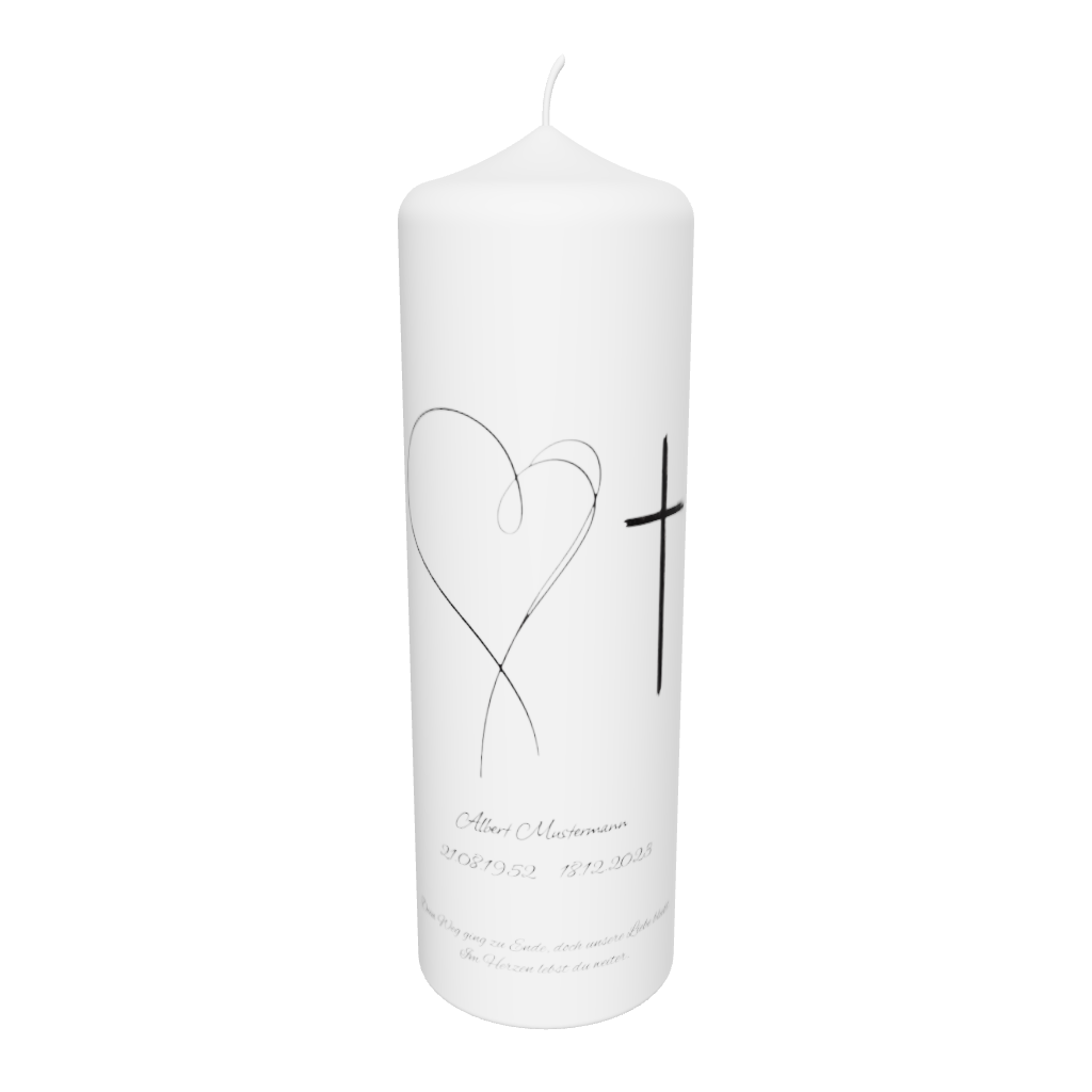 Diese stilvolle Trauerkerze zeigt ein zartes Linienherz, das sich sanft mit einem schlichten Kreuz verbindet – ein Symbol für Liebe, Hoffnung und bleibende Verbundenheit.