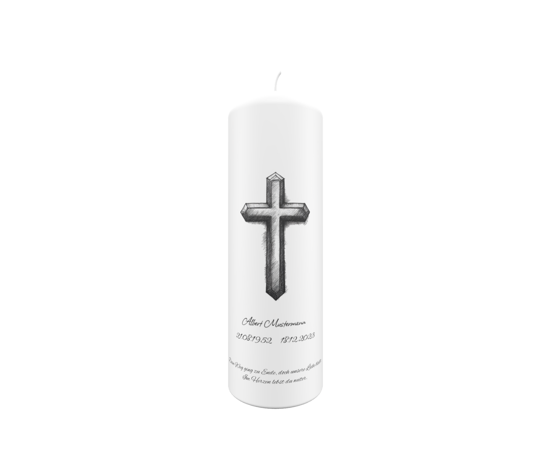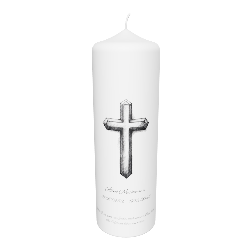 Die Trauerkerze „Skizzenkreuz“ besticht durch ihre schlichte, ausdrucksstarke Gestaltung.